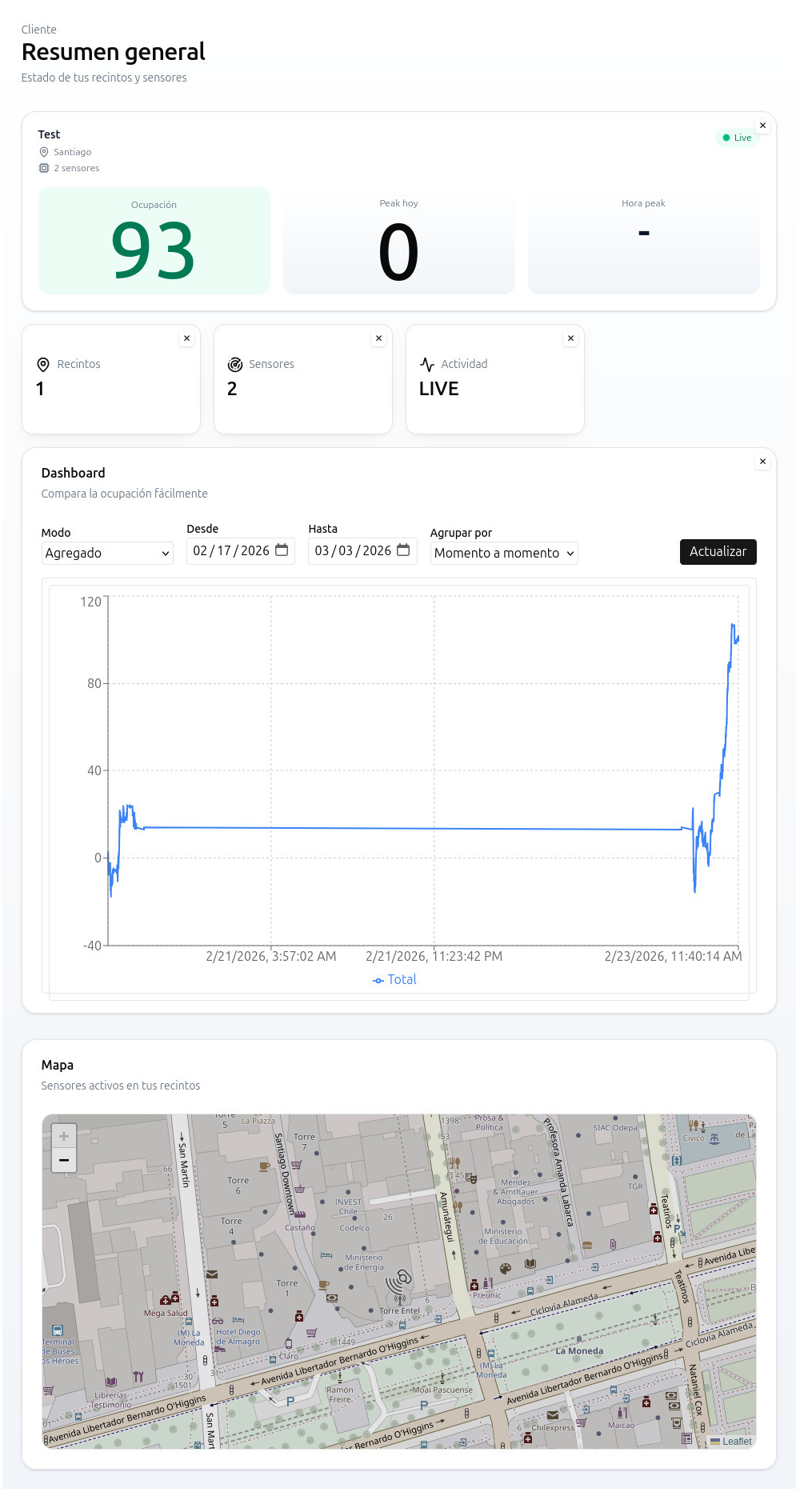 Personas simultáneas en zona. Capacidad en tiempo real y alertas.